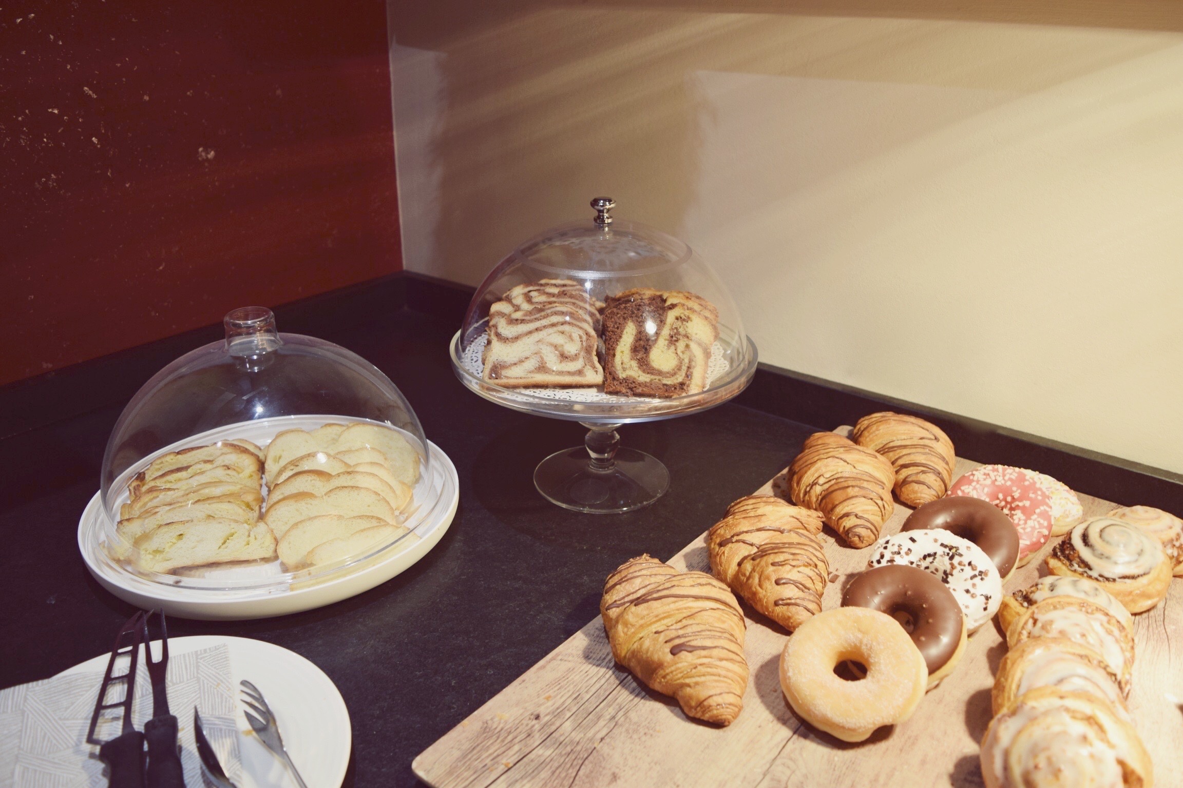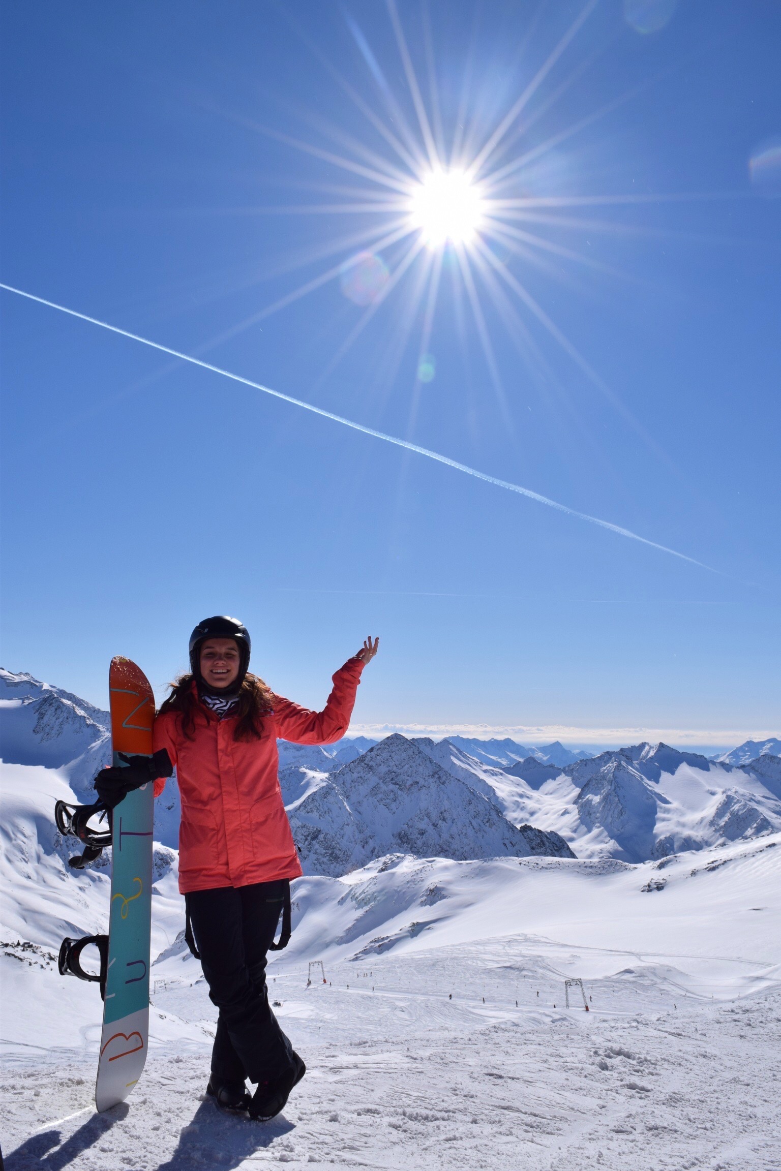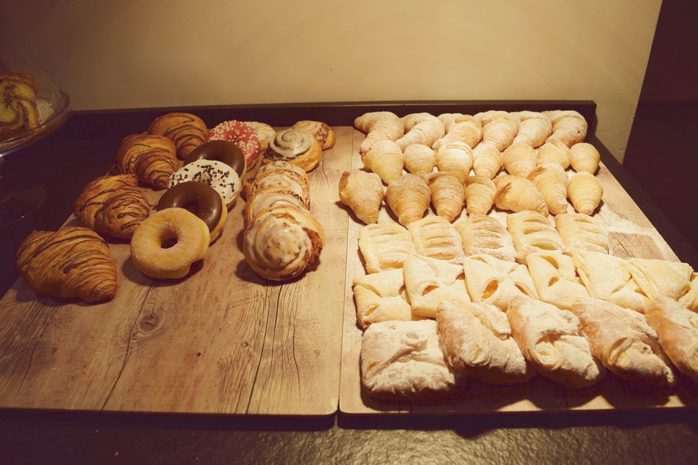 The next morning was also jaw dropping because the breakfast buffet was also crazy. Donuts, muffins, croissants and sweet cakes were set for us. You could order pancakes, eggs. Everything you can think about: they had it. AMAZING!!! The first day of snowboarding was just great. We had beautiful weather and the snow was perfect. It was pretty cold, but in the sun it was fine. I always hire a snowboard and this time I had an amazing Burton snowboard.
