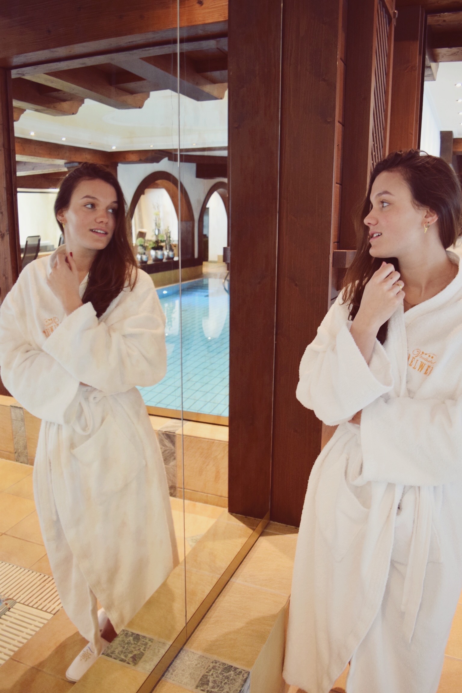 We had the loveliest stay in Vital Hotel Edelweiss. We were welcomed with lots of love and everyone was so friendly! We arrived on Sunday around 6 o’clock. We settled down first and when we arrived in the amazingly luxurious dining room, I couldn’t believe what I saw. There was a buffet with lots of sushi, sashimi and all kinds of delicious food. The quality was so great. Everyday we had a five-course menu and everyday I was stressed I couldn’t eat the desert, because I was already satisfied. The hotel had its own ‘House Dog’: Kiara. I was in love with her.