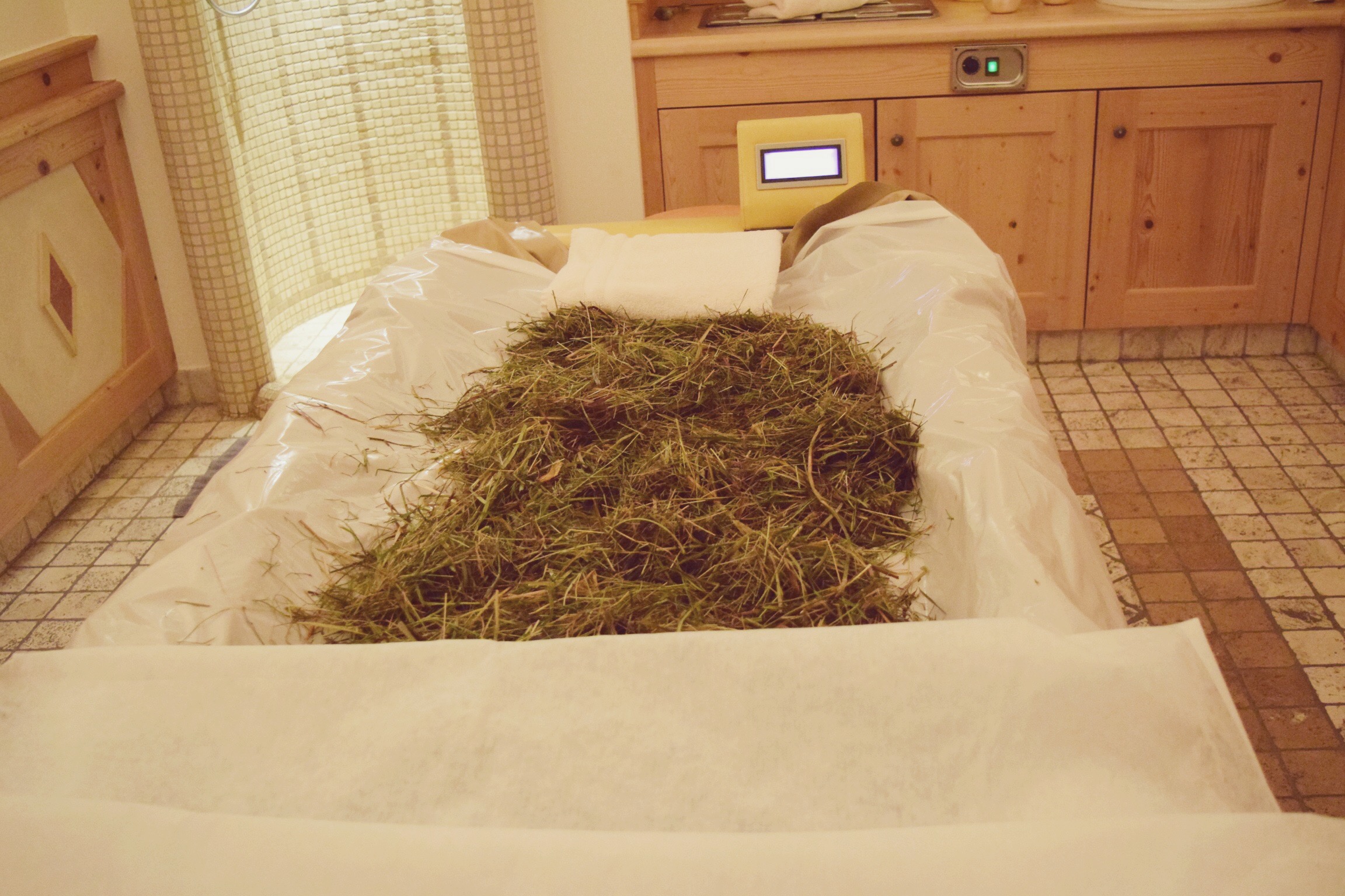 The next treatment was the Stubai Heublumen. That was a whole new experience for me! I was told something about a water-bed, so I thought I had to lay down on a bed or something. But when I arrived I saw a sort of deep cradle filled with dried grass. The beauty therapist explained to me that they used in this cradle their own grass from around the hotel and that grass stimulates your blood circulation and strengthens your immune system. It also helps against the cold. First the therapist applied a sugar scrub, then she wrapped me in very warm blankets. After that she lowered me in the water-bed. The water was so warm and it felt just amazing. It was such an experience.